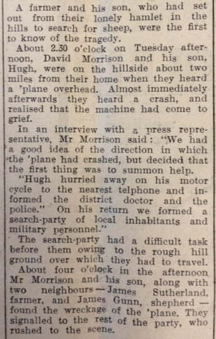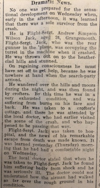 It wasn’t till afterwards that it was realised that not everyone on board had been killed. Flight Sergeant Jack had been the plane’s rear gunner and had been thrown clear when it crashed, and knocked unconscious. When he regained his senses he went in search of help, so that he was missed by the search party: “He wandered over the hills and moors during the night, and was then found by crofters. By this time he was in a very exhausted condition, and was suffering from burns on his face and back.” He was treated by the local doctor, and subsequently taken to hospital: “The doctor could not understand how the airman had walked so far over the rough ground in his condition.”