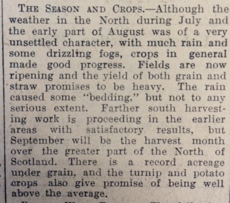 After a very familiar-sounding summer, the John O’Groat Journal reported that “although the weather in the North during July and the early part of August was of a very unsettled character, with much rain and some drizzling fogs, crops in general made good progress”. It added that harvesting was already underway further south, “but September will be the harvest month over the greater part of the North.”Schools across the county went back for the autumn term on 25 August, though a number of children had picked up various ailments during the summer holidays. The log book for Dunnet Crossroads School records: “28 August: The attendance in the Infant Room was very good, but two pupils in the Senior Room were absent all week under medical supervision.”