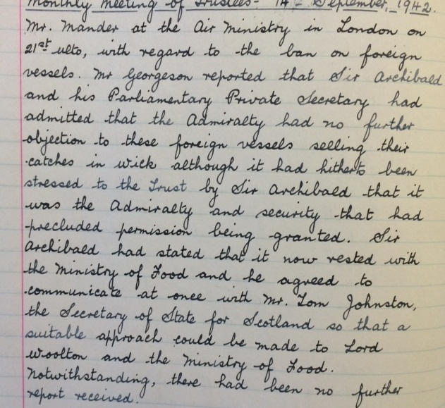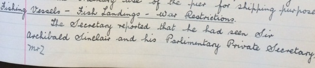 Finally this week, the Wick Harbour Trust recorded their displeasure with the conduct of Sir Archibald Sinclair over the ban on foreign fishing vessels being allowed to sell their catches at Wick. Sir Archibald, who was the sitting MP, had previously assured the Trust that the Admiralty had