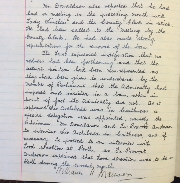 insisted on the ban for security reasons; but it now emerged that the Admiralty had no objections, and it was a question for the Ministry of Food. The minute book pulls no punches: “The Trust expressed indignation … that the present situation had been mis-represented as they had been given to understand by the Member of Parliament, that the Admiralty had imposed and insisted in a ban, when in point of fact the Admiralty did not.” Ominously, the Trust appointed a “special delegation” to “interview” Sir Archibald as he was currently in Caithness.