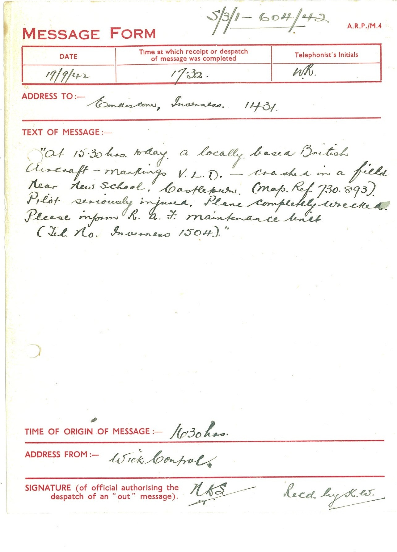 On 19 September Wick Incident Control reported to inverness: “At 15.30 hrs. today a locally based British Aircraft – markings V.L.D. – crashed in a field near New School, Castletown. Pilot seriously injured. Plane completely wrecked. Please inform R.A.F. maintenance unit.”