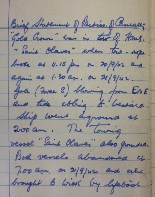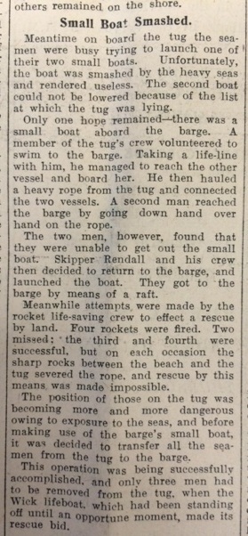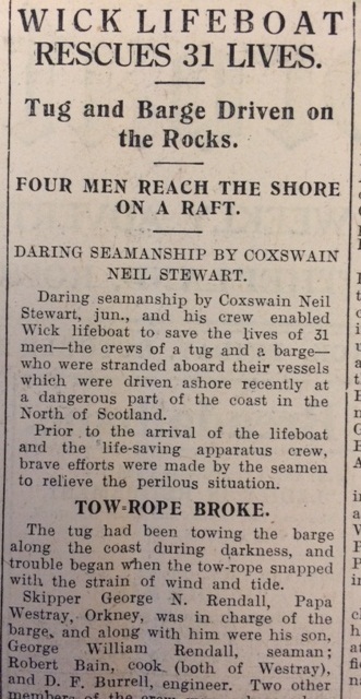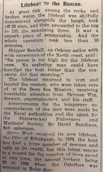 referred to a plague of rats coming from the Dam, etc., at Oldwick, and causing trouble at Cairndhuna Terrace and elsewhere. Bailie Bain also referred to the presence of rats at the Railway Station and Goods Yards.” The Council decided to complain to the Railway Company and the County Council, as it was a public health matter and affected Council properties. Finally this week, the John O’Groat Journal reported a daring rescue by the Wick lifeboat when a tug and barge were driven onto the rocks. The incident had in fact happened on 21 September, and was recorded in the Receiver of Wrecks log book: “Gold Crown was in tow of HMS Saint Olaves when tow-rope broke… Gale (force 8) blowing from E.N.E. and tide ebbing to westward. Ship went aground at 2.00 am. The towing vessel Saint Olaves also grounded. Both vessels abandoned at 7.00am on 21/9/42 and crew brought to Wick by lifeboat.” This bald account doesn’t begin to describe the drama and danger of the situation. As the paper reported, first of all some of the crew managed to get ashore to raise the alarm. Meanwhile, others tried to launch the tug’s boats, but one was “smashed by the heavy seas” and the other couldn’t be launched. Several attempts were made to fire a line from the shore by rocket, “but on each occasion the sharp rocks between the beach and the tug severed the rope”. Then the lifeboat arrived: “At great risk among the rocks and broken water, the lifeboat was skilfully manoeuvred alongside the barge, took off 28 men, and then returned to the tug to lift the remaining three. It was a superb piece of seamanship. And the whole operation took less than 10 minutes.” The paper observed that “this latest rescue is a record for the number of lives saved at one time.”