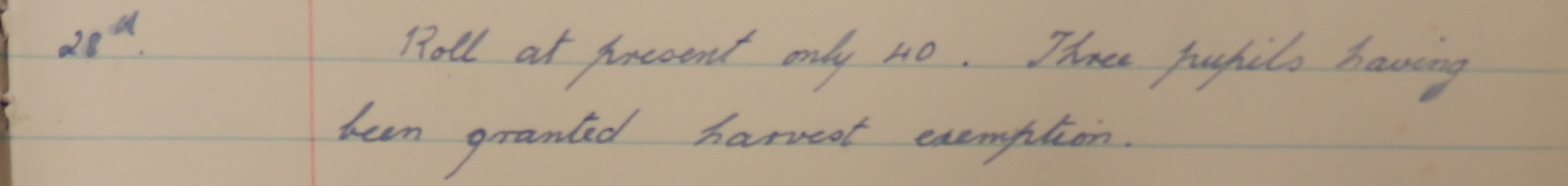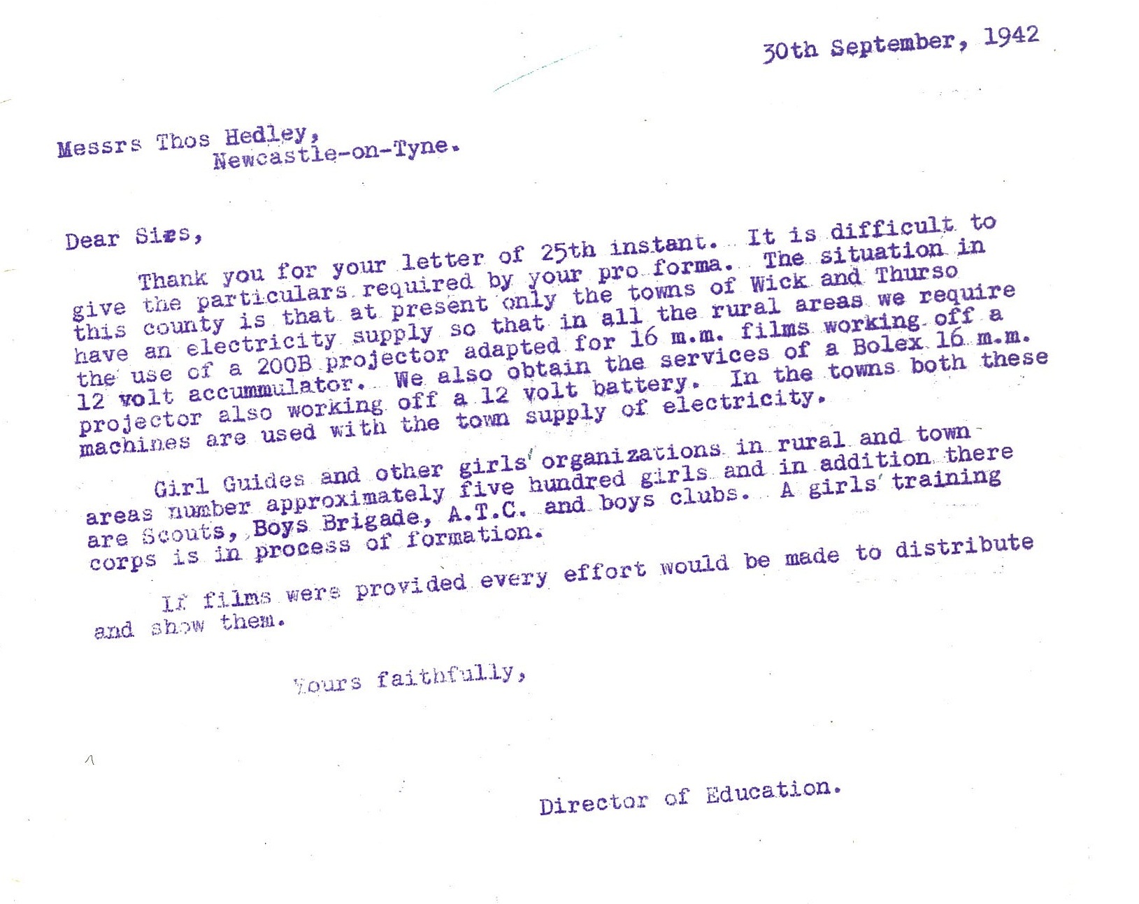 Across the county children were still being taken out of school to help with the harvest, as the log books for Bower parish show. In Stemster School, “3 senior boys absent today, as they are helping with the harvest”, while in Bower School “Roll at present only 40, three pupils having been granted harvest exemption.”The Director of Education this week replied to a letter about the showing of films in schools and revealed the state of the county’s electricity supply: “The situation in this county is that at present only the towns of Wick and Thurso have an electricity supply so that in all the rural areas we require the use of a 200B projector adapted for 16mm films working off a 12 volt accumulator.”
