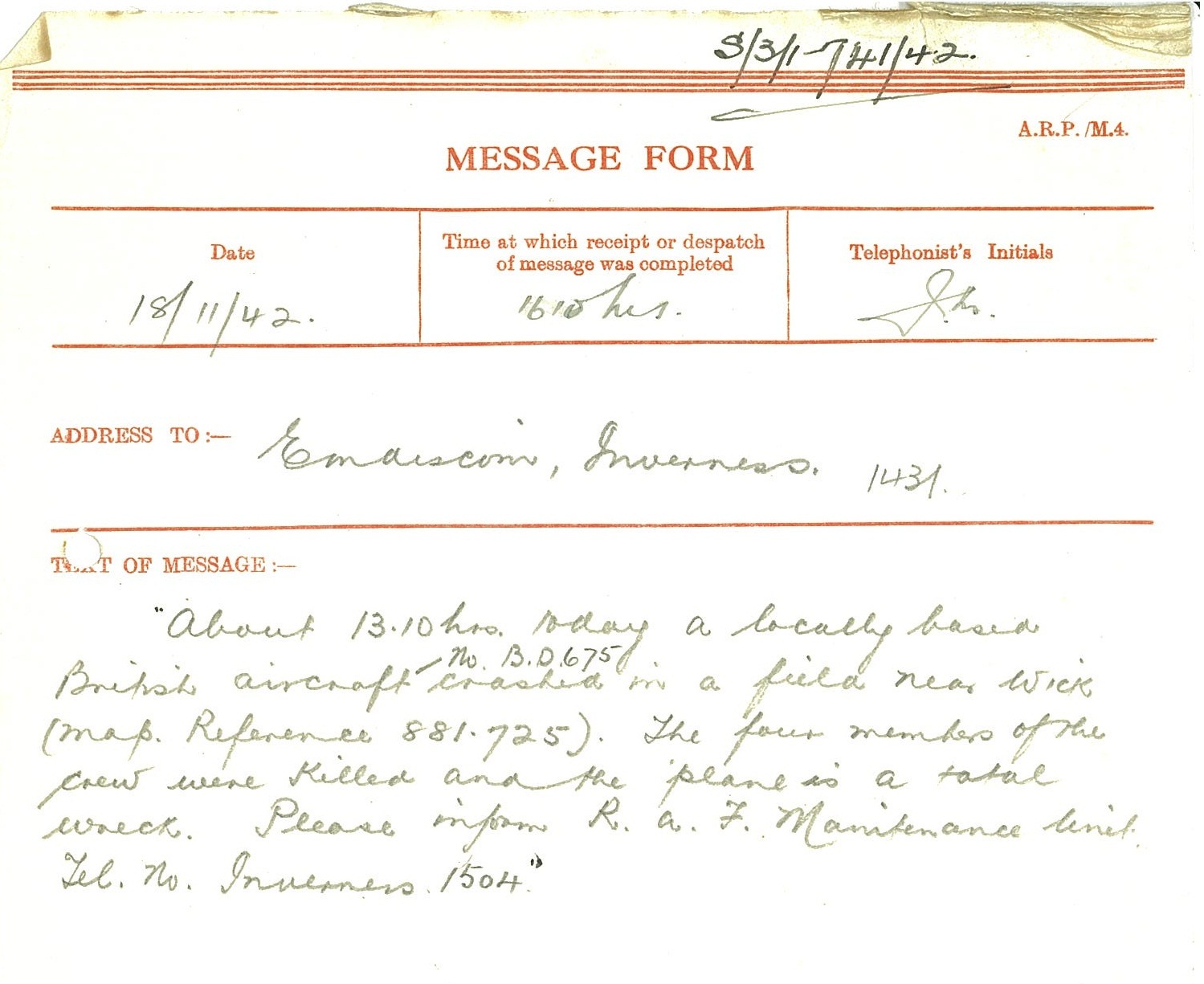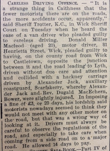 On 18 November the Caithness Constabulary passed on the following melancholy message to their colleagues in Inverness: “About 13.10 hours today a locally based British aircraft No. B.D.675 crashed in a field near Wick… The four members of the crew were killed and the plane a total wreck. Please inform R.A.F. Maintenance Unit Tel. No. Inverness 1504.”The John O’Groat Journal reported this week that a van driver, Donald Miller, had been fined £20 for careless driving. The accident happened on the county road from Wick to Castletown, when Miller had turned out of the junction with the Lyth road without looking to see if anyone was coming and collided with another car. As Sheriff Trotter observed moodily in court, “It is a strange thing in Caithness that the fewer motorists there are on the roads, the more accidents occur, apparently.”