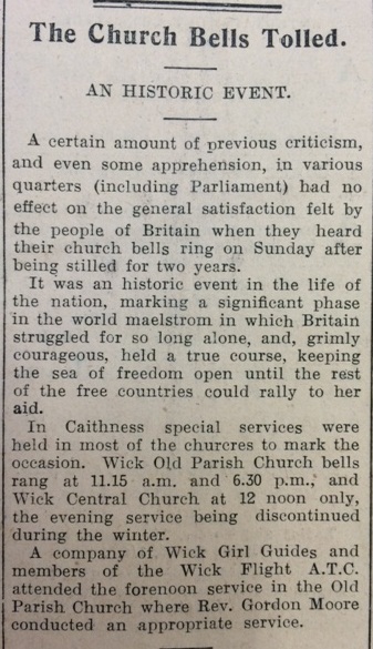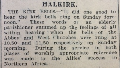 The John O’Groat Journal reported this week on the ringing of the church bells last Sunday for the victory at El Alamein (as Churchill said, “Before Alamein we never had a victory; after Alamein we never had a defeat”). In Caithness, “special services were held in most of the churches to mark the occasion. Wick Old Parish Church bells rang at 11.15 a.m. and 6.30 p.m., and Wick Central church at 12 noon only, the evening service being discontinued during the winter.”In Halkirk the bells of the Abbey and West Churches were rung at 10.50 and 11.50 respectively. “It did one good to hear the kirk bells ring on Sunday forenoon.” As the paper reported, “These words of an elderly parishioner summed up the feelings of all within hearing.”