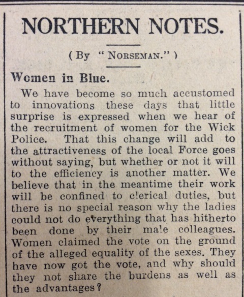 Finally this week, “Norseman” in the John O’Groat Journal addressed the question of women being recruited into the Wick Police. Taking his life into his hands he observed, “That this change will add to the attractiveness of the local Force goes without saying, but whether or not it will add to the efficiency is another matter.” But then, he reflected ironically, although they were currently restricted to clerical duties, “there is no special reason why the ladies could not do everything that has hitherto been done by their male colleagues.” Interesting to see how attitudes have changed in 73 years, which in historical terms is the equivalent of a mere 3 generations…