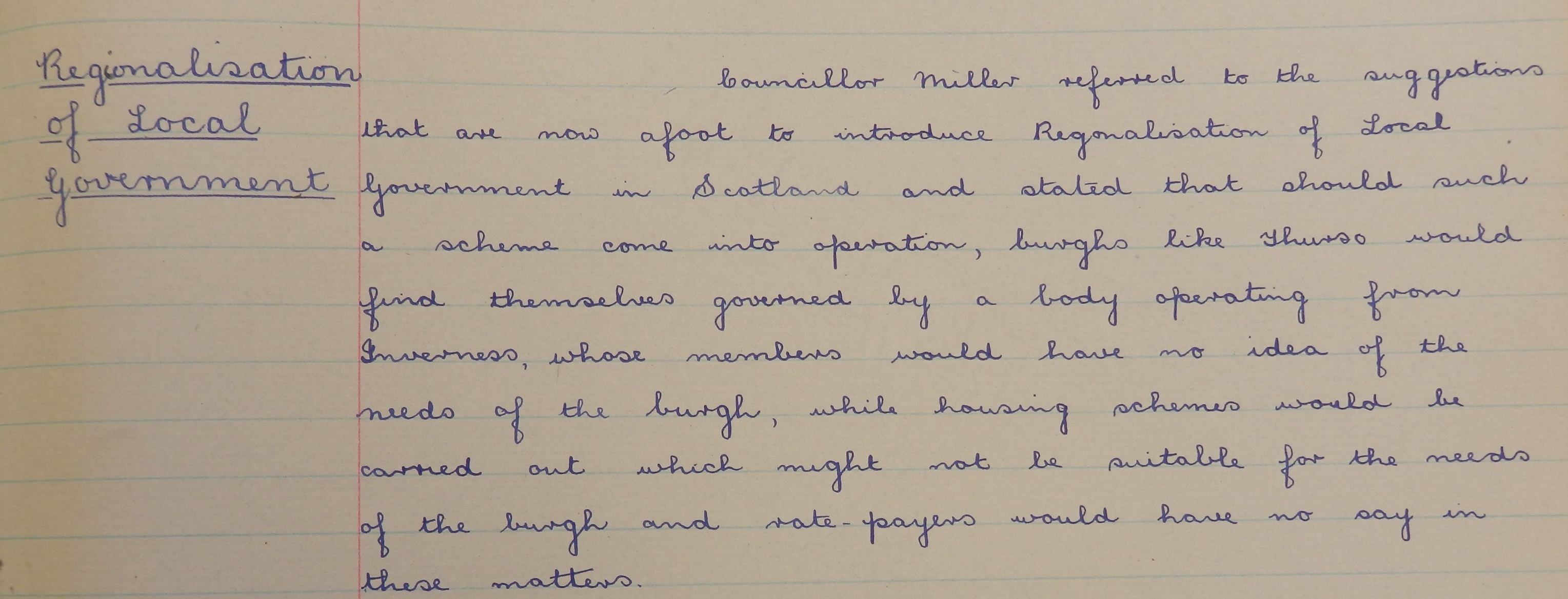 Meanwhile, Thurso Burgh Council was unhappy about the suggestions for regionalisation of local government in Scotland. Councillor Miller “stated that should such a scheme come into operation, burghs like Thurso would find themselves governed by a body operating from Inverness, whose members would have no idea of the needs of the burgh”. The Council agreed to send a resolution to the Convention of Scottish Burghs to “give a quietus” to such a scheme.
