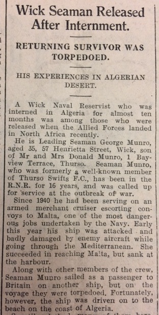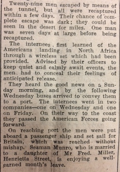 joined in: “Eventually a long tunnel, stretching beyond the camp, had been dug. Twenty-nine men escaped by means of the tunnel, but all were recaptured within a few days. Their chance of complete escape was dark; they could be seen in the desert for miles.” Fortunately the recent American-led invasion of North Africa, Operation Torch, led to men finally being released. Seaman Munro was now back in Wick, “enjoying a well-earned month’s leave.”