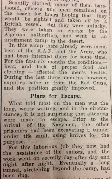 Finally this week, the John O’Groat Journal reported the story of Leading Seaman George Munro from Henrietta Street in Wick. He had served on the dangerous Malta convoys and his ship had been attacked, finally sinking in Malta harbour. Along with the rest of the crew, Seaman Munro returned as a passenger in another ship, but it was torpedoed and ran aground on the coast of French Algeria. The navy men were interned by the Algerian authorities and sent to an internment camp in the desert: “For the first six months the conditions – heat, and lack of proper food and clothing – affected the men’s health.”