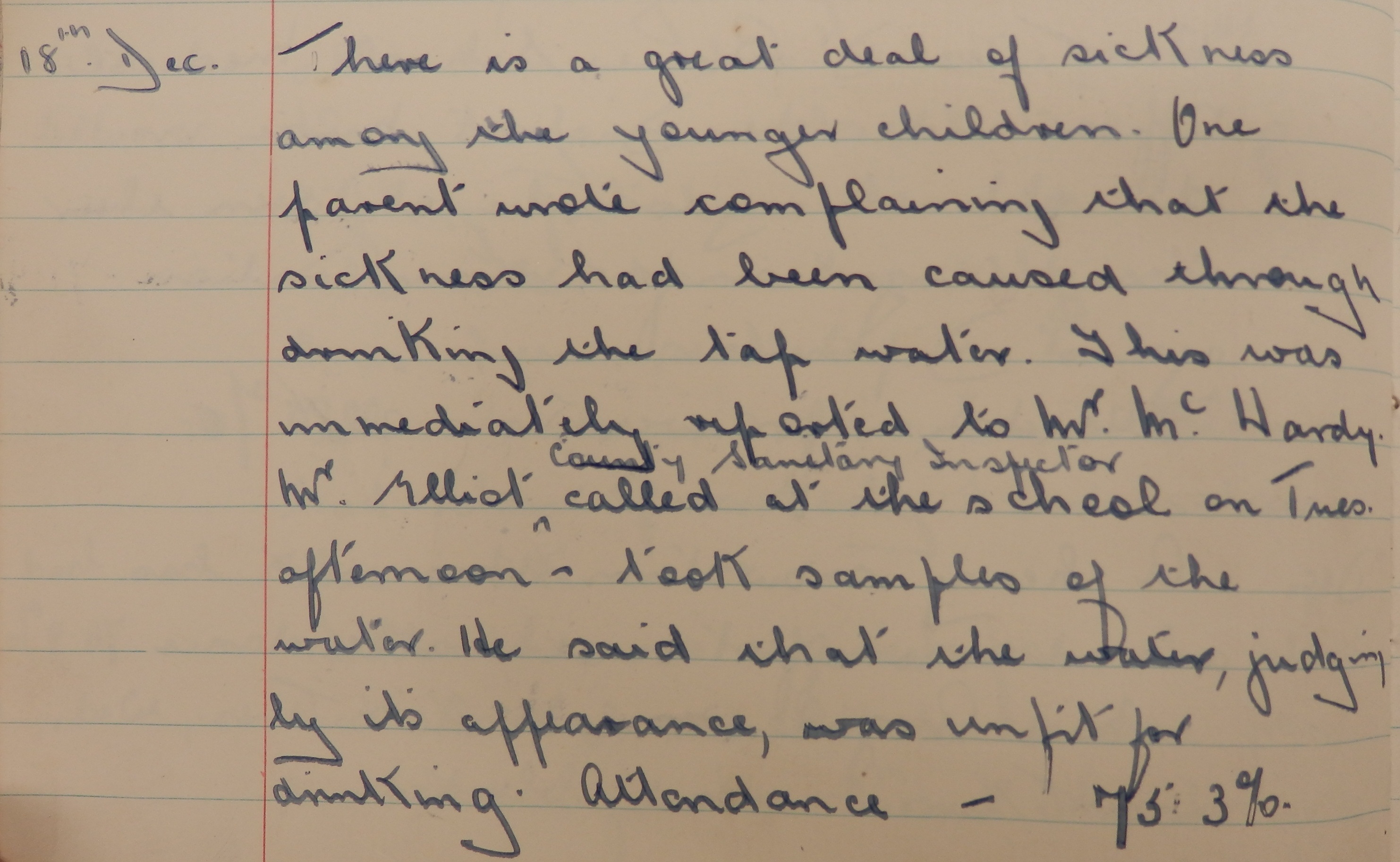 Things were not going so well in Bilbster School, however: “There is a great deal of sickness among the younger children. One parent wrote complaining that the sickness had been caused through drinking the tap water. This was immediately notified to Mr McHardy [Director of Education]. Mr Elliot, County Sanitary Inspector, called at the school on Tues. afternoon – took samples of the water. He said that the water, judging by its appearance, was unfit for drinking.”