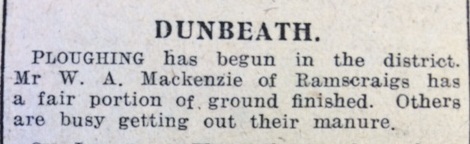 In Dunbeath, however, the focus was already on the next harvest: “Ploughing has begun in the district. Mr W.A. Mackenzie of Ramscraigs has a fair portion of ground finished. Others are busy getting out their manure.”