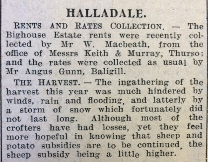 The John O’Groat Journal offered a retrospective on the Halladale harvest: “The ingathering of the harvest this year was much hindered by winds, rain and flooding, and latterly by a storm of snow which fortunately did not last long. Although many of the crofters have had losses, yet they feel more hopeful in knowing that sheep and potato subsidies are to be continued.”