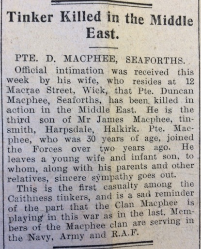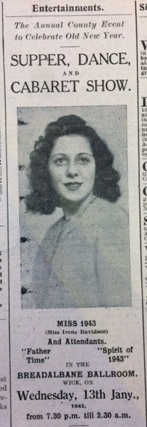 Across the county, schools were breaking up for the Christmas holidays. The Dunnet Public School log book records that on 23 December: “School closed to-day for the Christmas Vacation. The average attendance was 99.1%. As usual, the children with their parents and friends enjoyed their Xmas Party during the afternoon. Mr Moir presided and a programme of songs, sketches, recitations and singing games were given by the children. Tea was served by members of the W.R.I. committee.” The John O’Groat Journal reported the death of Private Duncan Macphee of Harpsdale, Halkirk, who had been serving with the Seaforths. As the paper noted, “This is the first casualty among the Caithness tinkers, and it is a sad reminder of the part that the Clan Macphee is playing in this war, as in the last. Members of the Macphee clan are serving in the Navy, Army and R.A.F.”Finally this week, preparations were underway to celebrate the Old New Year with the traditional supper, dance and cabaret show. Presided over by “Miss 1943”, in the person of Miss Irene Davidson of Willowbank, Wick, it was scheduled for 13th January in the Breadalbane Ballroom.