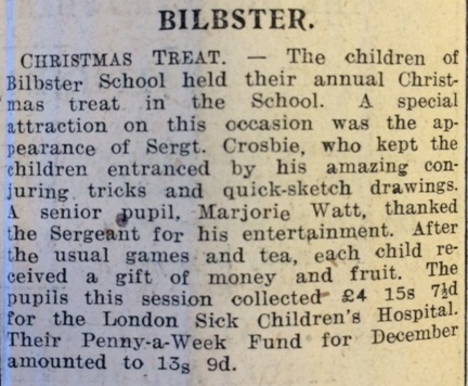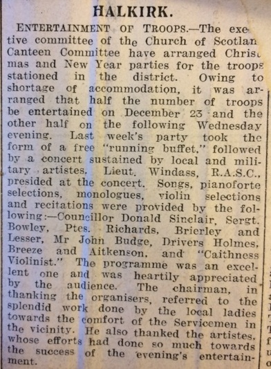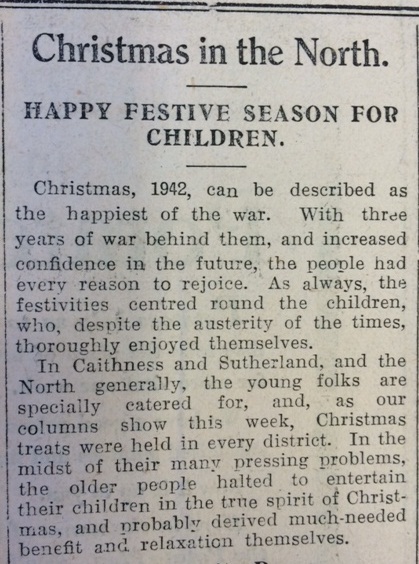 The children of Bilbster School “held their annual Christmas treat in the School. A special attraction on this occasion was the appearance of Sergt. Crosbie, who kept the children entertained by his amazing conjuring tricks and quick-sketch drawings… After the usual games and tea, each child received a gift of money and fruit.”Finally this week, in Halkirk, it was the troops who were entertained as part of a series of Christmas and New Years’ parties in the district organised by the Church of Scotland Canteen Committee. “Owing to shortage of accommodation, it was arranged that half the number of troops be entertained on December 23 and the other half the following Wednesday evening [30 December]. Last week’s party took the form of a ‘running buffet’, followed by a concert sustained by local and military artistes.”
