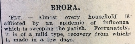Back in the north Highlands, the John O’Groat Journal reported that Brora was in the grip of a flu epidemic: “Almost every household is afflicted by an epidemic of influenza which is sweeping the parish. Fortunately it is of a mild type, recovery from which is made in a few days.”