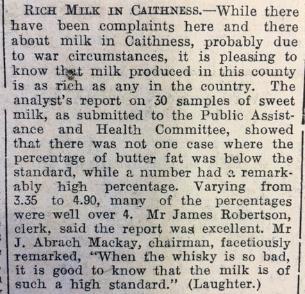 The paper also noted that Caithness milk remained of a high quality: “While there have been complaints here and there about milk in Caithness, probably due to war circumstances, it is pleasing to know that milk produced in this county is as rich as any in the country.” An analyst’s report showed that “there was not one case where the percentage of butter fat was below the standard, while a number had a remarkably high percentage.” As the Chairman of the Public Assistance and Health Committee joked, “’When the [quality of wartime] whisky is so bad, it is good to know that the milk is of such a high standard.’ (Laughter)”