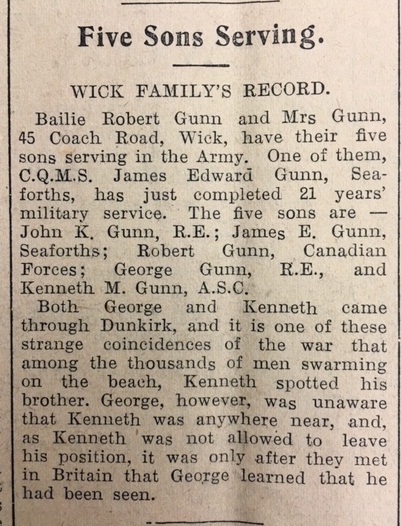 The John O’Groat Journal reported that Bailie Robert Gunn and his wife of Wick had all their five sons serving in the armed forces. “Both George and Kenneth [Gunn] came through Dunkirk, and it is one of these strange coincidences of the war that among the thousands of men swarming on the beach, Kenneth spotted his brother. George, however, was unaware that Kenneth was anywhere near and, as Kenneth was not allowed to leave his position, it was only after they met in Britain that George learned that he had been seen.”