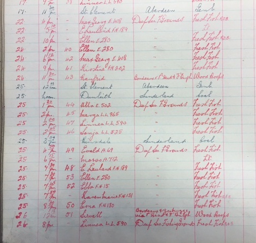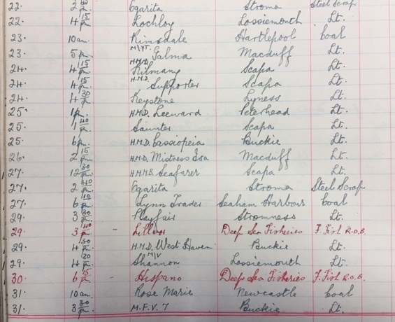Wick as a fishing port. Here are two entries from the ledger of the sailings from Wick Pierhead. One is from January 1939, and the entries show a profusion of boats landing fresh fish from the Deep Sea Fisheries. The other is from January 1943, and this time the vessels are overwhelmingly Admiralty vessels, or ships in the service of the Forces: there are only one or two fishing boats, and they are almost all foreign.