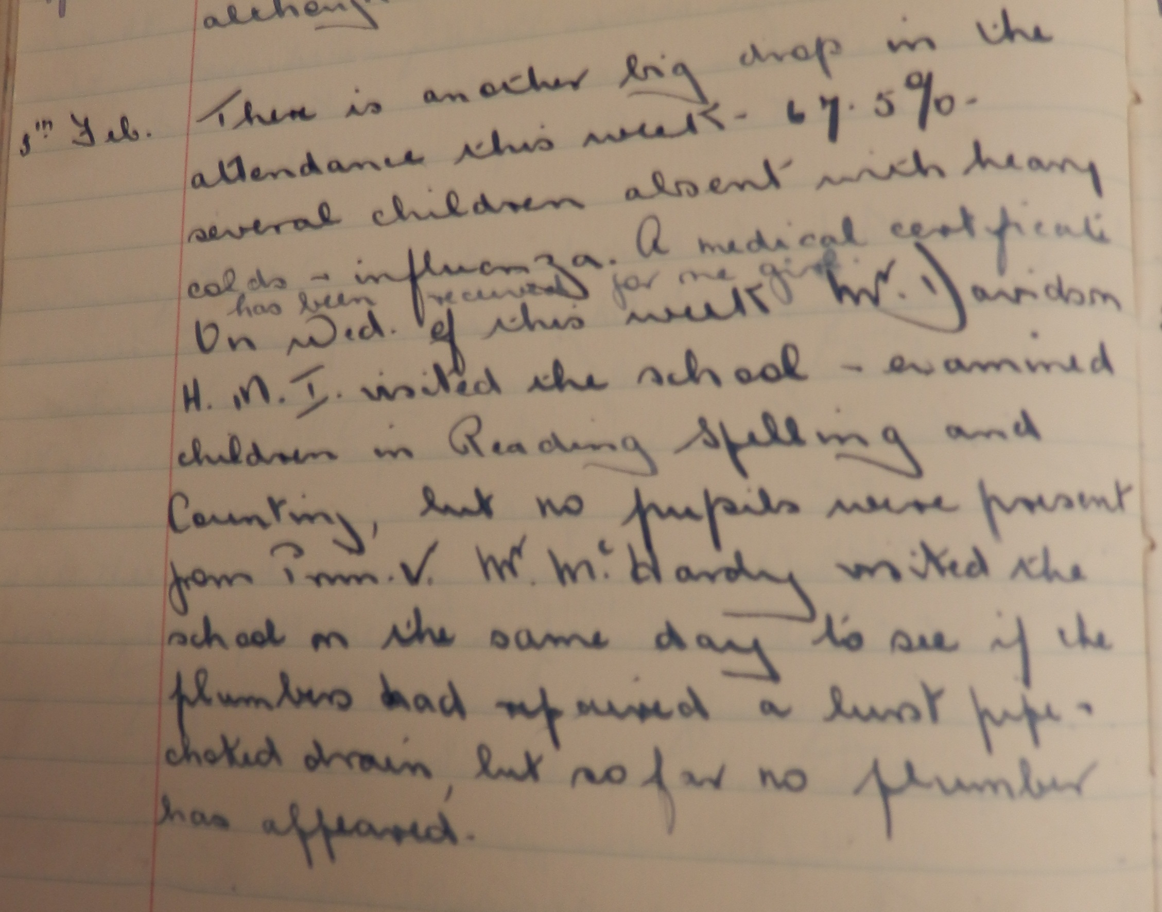 The Head Teacher of Bilbster School reported on 3 February: “There is another big drop in the attendance this week – 67.5% – several children absent with heavy colds & influenza”. And, as if that wasn’t enough: “Mr McHardy [the Director of Education] visited the school… to see if the plumbers had repaired a burst pipe & choked drain, but so far no plumber has appeared.”