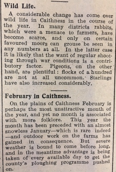 In the John O’Groat Journal, “Norseman” observed that “On the plains of Caithness February is perhaps the most unattractive month of the year… This year the month has been preceded with an almost snowless January – which is rare indeed – and outdoor work on farms has gained in consequence.” He also noted that wildlife in Caithness was different than in other times: “In many districts rabbits, which were a menace to farmers, have become scarce, and only on certain favoured moors can grouse be seen in any numbers at all,” though as he says, the latter is probably a result of wartime shooting restrictions.