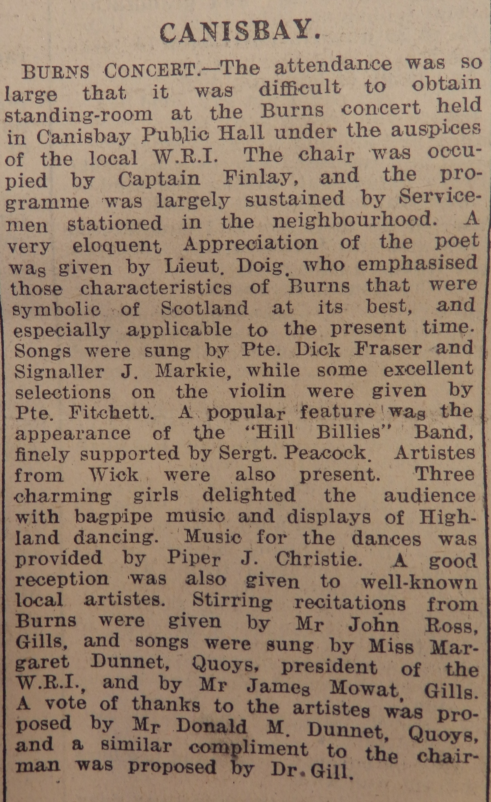 according to the John O’Groat Journal, with much of the entertainment provided by local troops as well as local talent: “A popular feature was the appearance of the “Hill Billies” Band, finely supported by Sergt. Peacock. Artistes from Wick were also present. Three charming girls delighted the audience with bagpipe music and displays of Highland dancing. Music for the dances was provided by Piper J. Christie.”