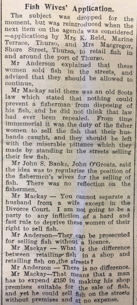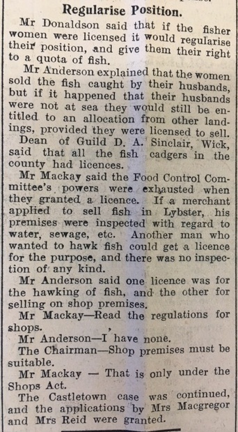 The John O’Groat Journal reported the debate by Caithness Food Committee over the right of fishermen’s wives to sell fish around the streets of Thurso, for which they needed a licence: “Mr Anderson explained that the women sold the fish caught by their husbands, but if it happened that their husbands were not at sea they would still be entitled to an allocation from other landings, provided they were licenced to sell.”