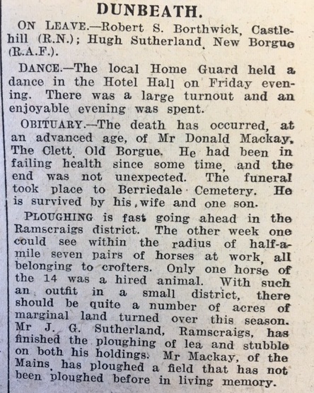 Stemster School had a distinguished visitor this week, when on 17 March “Nurse Cameron (Inspectress of Queen’s Nurses) visited the school at 10.30 this morning and gave a very interesting talk to the pupils on health and cleanliness.”The Dunbeath report in the John O’Groat Journal stated that ploughing was fast going ahead at Ramscraig, including the ploughing of lea and stubble: “one could see within the radius of half-a-mile seven pairs of horses at work, all belonging to crofters. Only one horse of the 14 was a hired animal”.