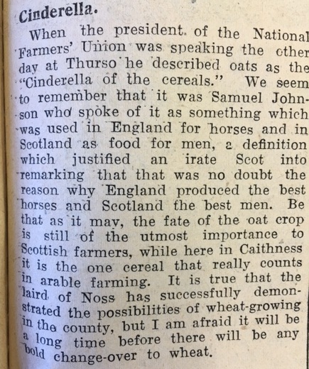 Farming was also on the mind of ‘Norseman’ in the same edition of the paper, noting that the president of the National Farmers’ Union in a speech in Thurso had described oats as the “Cinderella of cereals”. Norseman went on, “We seem to remember that it was Samuel Johnson who spoke of it as something that was used in England for horses and in Scotland as food for men, a definition which justified an irate Scot into remarking that that was no doubt the reason why England produced the best horses and Scotland the best men.” Norseman could not foresee a time when wheat would replace oats in Caithness, even though “the laird of Noss had successfully demonstrated the possibilities of wheat-growing in the county.”Finally this week, the Headmaster of Wick North School was obviously nettled by a communication from the County Clerk Depute for Education which stated that, “during Air Raid Alerts, teachers be instructed to see that pupils under their charge should go to Air Raid Shelters.” The school log book records that the Headmaster went to see the County Clerk Depute “personally” to discuss the instruction, “pointing out that only at three centres were there shelters for the pupils to go to.”