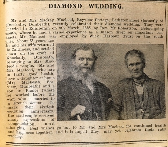 Finally this week, the John O’Groat Journal celebrated the diamond wedding of Mr and Mrs Mackay Macleod of Bayview Cottage, Latheronwheel. Married in Edinburgh in 1883 the couple came to Caithness 35 years earlier and originally lived in Mrs Macleod’s family croft at Knockally, Dunbeath. Their son had settled in France before the war broke out, and now risked his life with the Resistance helping Allied soldiers to escape. As the paper said, “Best wishes go out to Mr and Mrs Macleod for continued health and happiness together.”