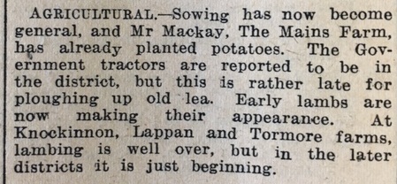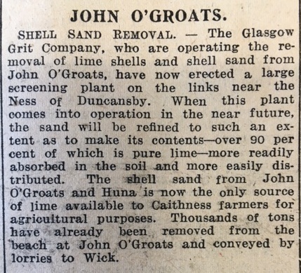 The John O’Groat Journal reported that Dunbeath, farmers were sowing and some were already planting potatoes. “The Government tractors are reported to be in the district, but this is rather late for ploughing up old lea [an open area of grassy or arable land].” The lambing season was now underway as well: “At Knockinnon, Lappan and Tormore farms lambing is well over, but in the later districts it is just beginning.”Also in the paper was news of the systematic removal of shell sand from John O’Groats and the construction of a large refining plant at Ness of Duncansby. “The shell sand from John O’Groats and Huna is now the only source of lime available to Caithness farmers for agricultural purposes. Thousands of tons have already been removed from the beach at John O’Groats and conveyed by lorries to Wick.”