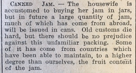 The John O’Groat Journal prepared its readers for another shock, with jam in future being sold in cans instead of jars. “Old customs die hard, but there should be no prejudice against this unfamiliar packing. Some of it has come from countries which have been able to maintain, to a higher degree than ourselves, the fruit content of the jam.”