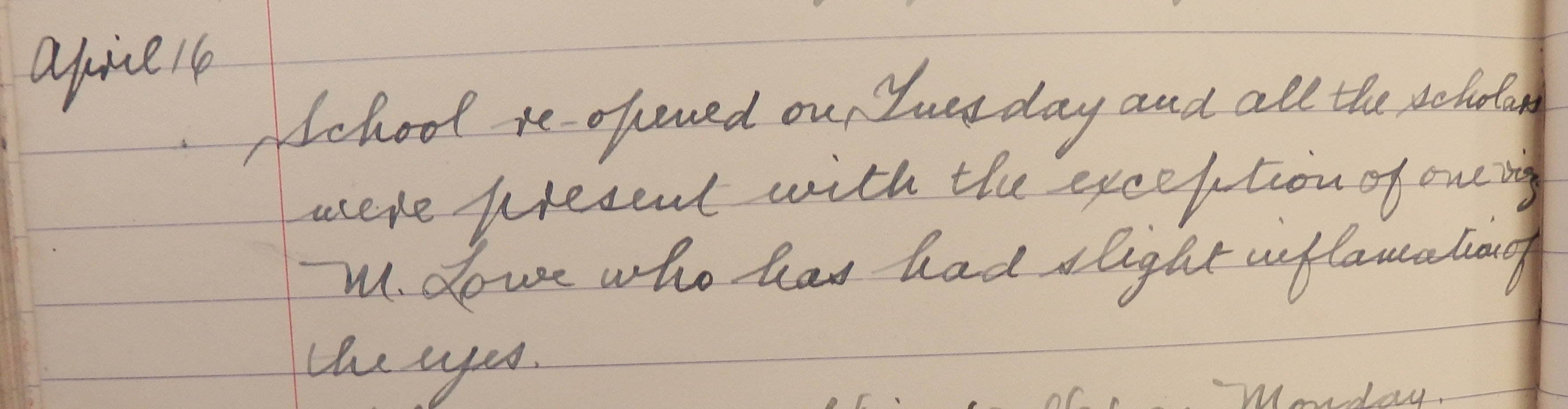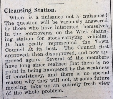 Schools across the county went back after the Easter holidays. As the School Log Book records, “School reopened on Tuesday and all the scholars were present with the exception of one viz. M. Lowe who has had a slight inflammation of the eyes.”It had been proposed to open a cleansing station at Wick Riverside, to meet sanitary regulations