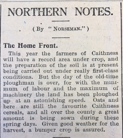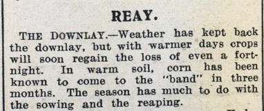 In much of Caithness the spring sowing was getting a boost from some fine weather. As the John O’Groat Journal noted, “This year the farmers of Caithness will have a record area under crop, and the preparation of the soil is at present being carried out under really first-class conditions… Oats and bere are still the favourite Caithness cereals, and all over the county a great amount is being sown during these spring days.”In Reay however, “Weather has kept back the downlay, but with warmer days crops will soon regain the loss of even a fortnight. In warm soil, corn has been known to come to the “band” in three months.”