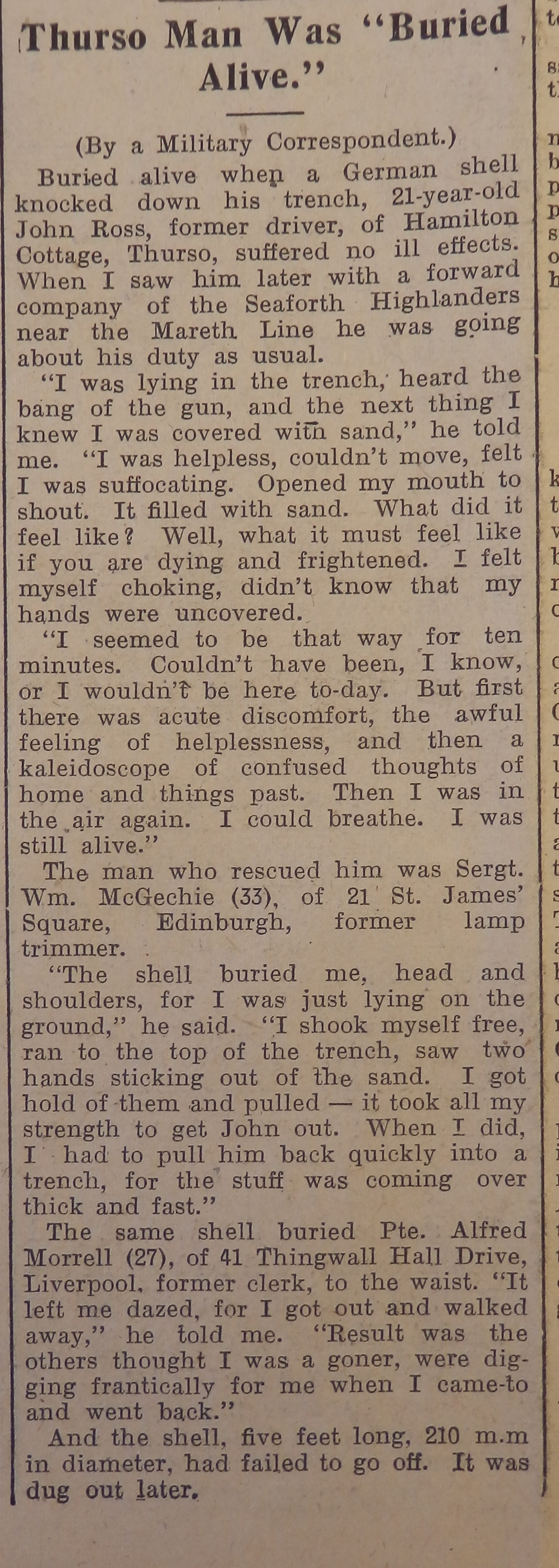about cleaning vehicles transporting livestock to and from market. This week in the John O’Groat Journal, “Norseman” took a sarcastic view of the lengthy debate so far: “The [Town] Council first approved, then disapproved, and now approved again. Several of the members have long since realised that there is no point in being hampered by the weakness of consistency, and there is no special reason why they will not, at some future meeting, take up an entirely fresh view of the whole problem.” Finally this week, the paper reported the fortunate escape of John Ross from Thurso, now a soldier in the Seaforth Highlanders. During the recent fighting in the Tunisian desert his trench was hit by a shell and he was buried alive in sand. “I was lying in the trench, heard the bang of the gun, and the next thing I knew I was covered in sand… I was helpless, couldn’t move, felt I was suffocating. Opened my mouth to shout. It filled with sand.” He was pulled out by his sergeant, who told a reporter: “I shook myself free, ran to the top of the trench, saw two hands sticking out of the sand. I got hold of them and pulled – it took all my strength to get John out. When I did, I had to pull him back quickly into a trench, for the stuff was coming over thick and fast.” Remarkably, the shell hadn’t even exploded.