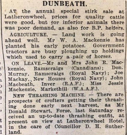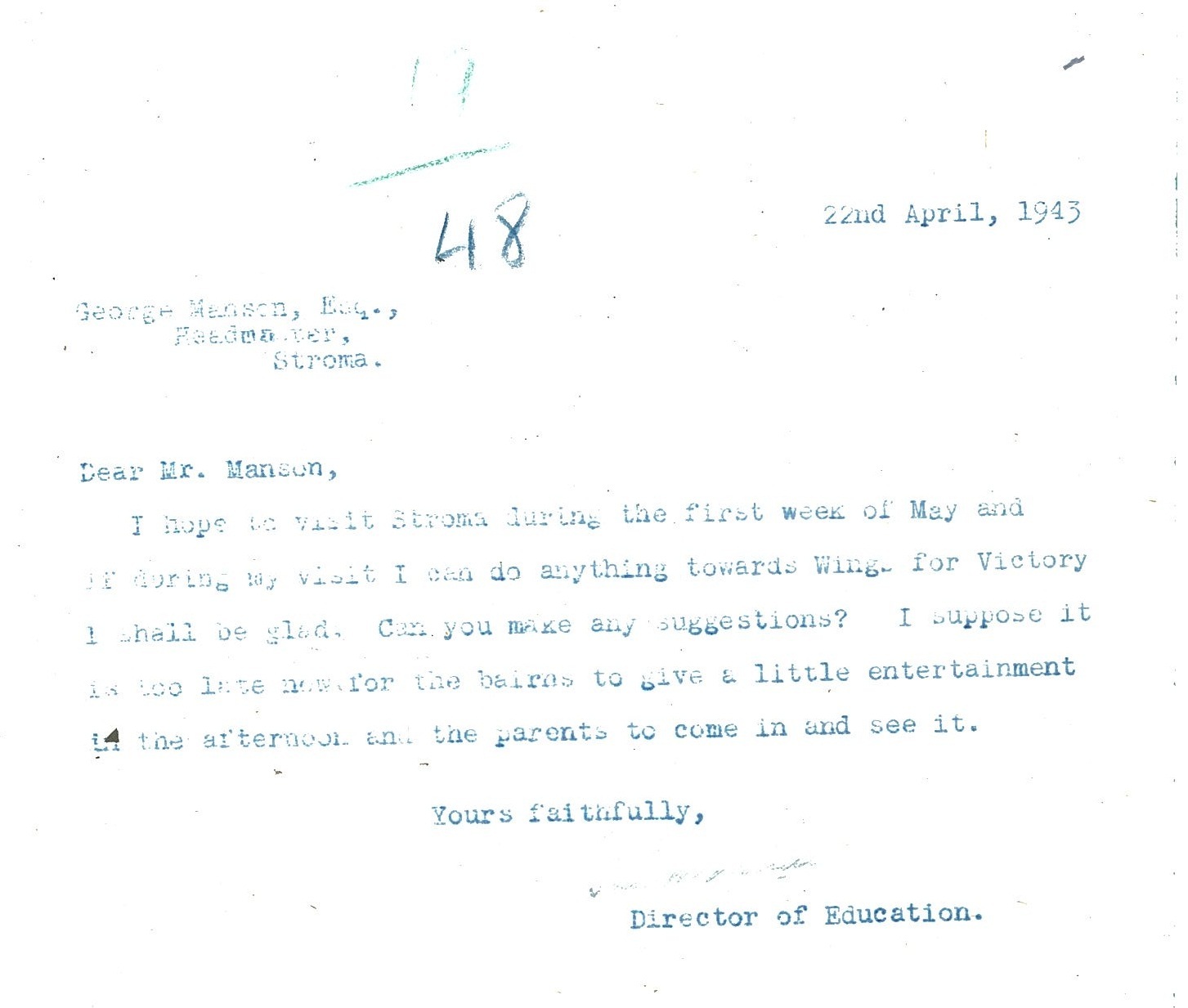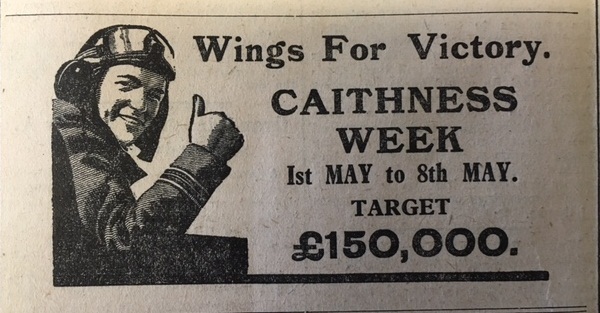 In Caithness farmers were busy across the county with land work and early potato planting. The John O’Groat Journal reported that in Dunbeath, “Government tractors are busy ploughing up holdings which used to carry a pair of horses.” It also noted that, “There are prospects of crofters getting their thrashing done early next harvest, as Mr Donald Stewart, Forse, last Saturday received an up-to-date thrashing outfit, at present on view at Latheronwheel Hotel.”The county was gearing up for “Wings for Victory” week. The Director of Education wrote on 22 April to the Head Teacher of Stroma School, “Can you make any suggestions? I suppose it is too late now for the bairns to give a little entertainment in the afternoon and the parents to come in and see it.”