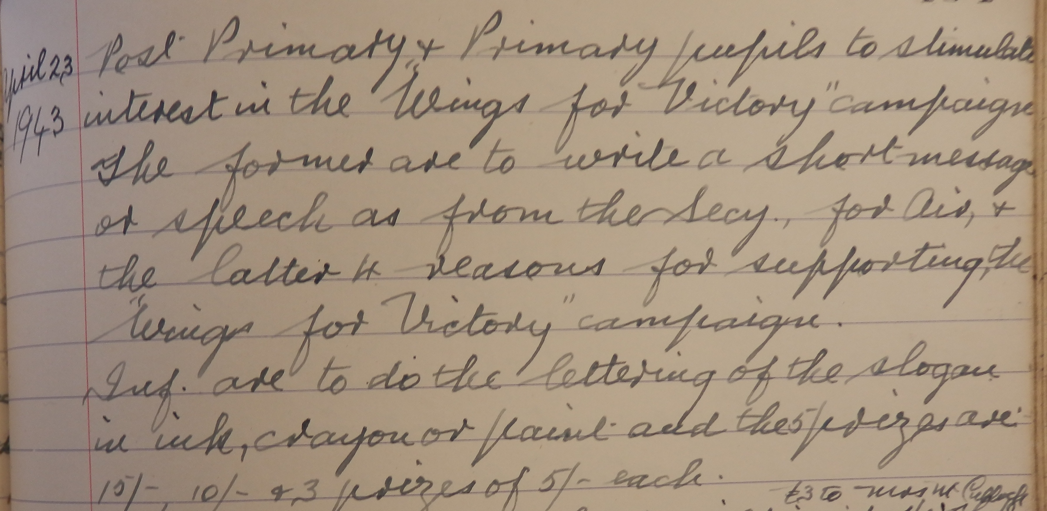 At Gillock School in Bower plans were well in train, as the School Log Book entry on 23 April attests. “Post Primary & Primary pupils to stimulate interest in the “Wings for Victory” campaign. The former are to write a short message or speech as for the [Secretary] for Air, & the latter 4 reasons for supporting the “Wings for Victory” campaign. [Infants] are to do the lettering of the slogan in ink, crayon or paint, and the prizes are 15s., 10s., & 3 prizes of 5s. each.”