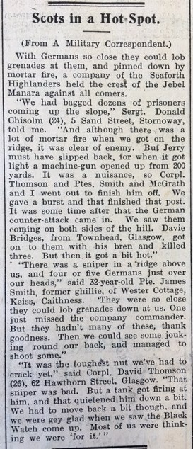 All across the north Highlands, farmers were busy laying down crops. In Halladale, as the John O’Groat Journal reported, “Oat-sowing is also well advanced and potato-planting is proceeding. In spite of the recent cold winds, grass and clover fields are coming along nicely… Moorland pasture also looks promising. Grouse are busy nesting.” The Head Teacher of Bower School recorded an accident outside the school on 5 May, which luckily was not serious: “A pupil while coming to School today met with an accident. Alighting from the “bus” he was involved in a collision with a van but most fortunately his injuries appear to be slight. The van driver took him along for medical attention.” According to the police report, “the accident was due to the boy rushing into the roadway from behind the bus”. The children of Ackergill School were in for a shock on Friday 7 May: “Dr Bruce and Nurse Spencer were at school on Tuesday for diphtheria immunisation. All the pupils who had not been previously immunised were done but one.” The Head Teacher of Pulteneytown Academy wrote in his log book with justifiable pride the same day, “In connection with “Wings for Victory” week, information has been received from the Manager, Aberdeen Savings Bank, that in their essay competition for primary pupils, out of 8 prizes for the County, three have been awarded to pupils from Pulteneytown Academy”. Finally this week, the John O’Groat Journal reported an interview with some soldiers from the Seaforth Highlanders who had recently held the ridge at Jebel Manara in Tunisia against German attack. “There was a sniper in a ridge above us, and four or five Germans just over our heads,” said 32 Year-old Pte. James Smith, former ghillie, of Wester Cottage, Keiss, Caithness. “They were so close they could lob grenades down on us. One just missed the company commander. But they hadn’t many of these, thank goodness. Then we could see some jouking [i.e., dodging] round our back, and managed to shoot some.”Coming soon! Week 193, 10th – 16th May 1943, will be published on Monday 9th May 2016. To view previous issues please use the menus on the right hand side of the page.