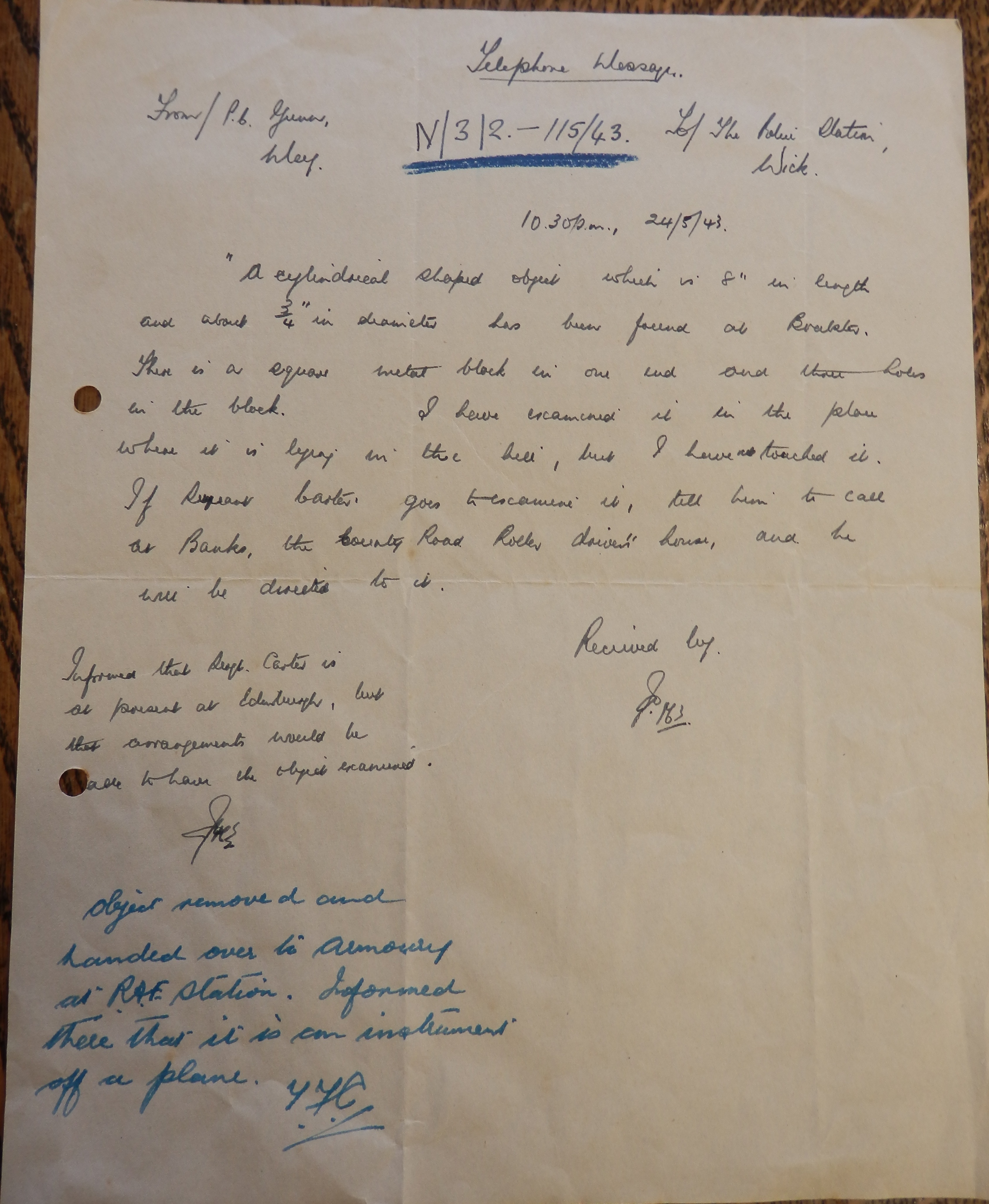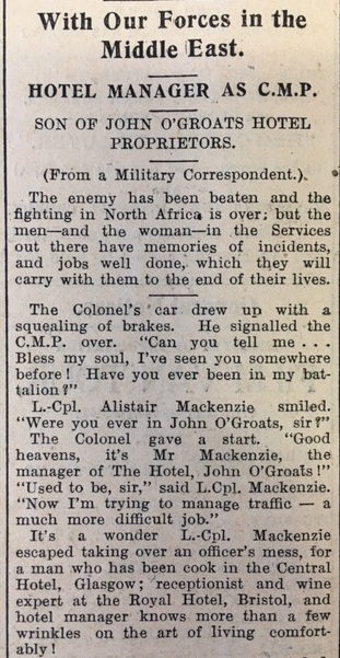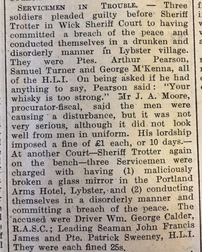In Caithness the farming season was moving on. In the south of the county farmers had already sowed their turnips and swedes while in Stroma, as the John O’Groat Journal reported, “Corn is coming on, but there are some signs of grub in lea corn. Hay is also doing well. A number of crofters are getting ready for the sowing of turnips.” As ever, children were being taken out of school to help. The log book of Gillock School records on 28 May: “The Begg family who had gone to live at Reaster, Lyth, left this school yesterday. E. Hossack is assisting at Peat Cutting, & K. Thomson and A. Bain are planting potatoes today.” Three privates of the Highland Light Infantry pleaded guilty at Wick Sheriff Court this week for committing a breach of the peace and being drunk and disorderly in Lybster village (where many people went to buy alcohol, since Wick enforced prohibition at this time). As the John O’Groat Journal reported, the procurator-fiscal admitted that “the men were committing a disturbance, but it was not very serious.” They were fined £1 each. When asked if they had anything to say one of the accused replied, “Your whisky is too strong.” On 24 May the police were notified that a “cylindrical shaped object” eight inches long had been found at Brabster in Watten: “I have examined it in the place where it is lying in the hill but I have not touched it.” A note at the bottom of the report adds, “Object removed and handed over to Armoury at RAF Station. Informed there that it is an instrument off a plane.” Finally this week, the John O’Groat Journal’s correspondent “With Our Forces in the Middle East” reported the sort of conversation that will be very familiar to anyone from Caithness. A colonel in Tunisia stopped to ask the way of a C.M.P. [a military policeman]:“Can you tell me… Bless my soul, I’ve seen you somewhere before! Have you ever been in my battalion?”