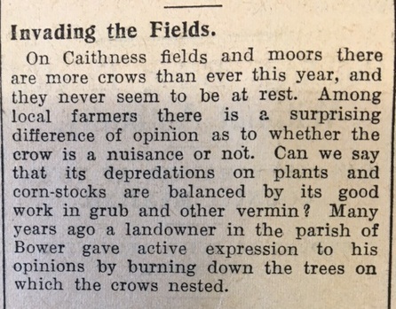 ‘Norseman’ in the John O’Groat Journal this week reflected on the county’s crow population, which was more numerous than ever, and recounted a drastic remedy to the problem. “Among local farmers there is a surprising difference of opinion as to whether the crow is a nuisance or not… Many years ago a landowner in the parish of Bower gave active expression to his opinions by burning down the trees on which the crows nested.” With spring well advanced, more children were being pulled out of school to help in the fields. The Head Teacher of Killimster School recorded in the log book on 31 May, “Jean R. Work has applied for leave of absence from school to assist in farm work.” As several teachers had noted in their log books, many children in Caithness did not have adequate shoes to wear, and the shortage of rubber caused by the war only made things worse. Some American charities even arranged for shipments of rubber boots to be sent specifically for British children. On 4 June the Head Teacher of Gillock School noted in the log book: “Wellington Boots. A certain number of these may be made available and granted to children (a) on special request by the teacher and (b) on production of a medical certificate.” Back on 7 May the children of Ackergill School had received their first diphtheria shots. Now as the school log book records, it was time for their second. “On Monday of this week Dr Bruce visited the school to give the second injection for diphtheria immunisation.” Finally this week the John O’Groat Journal reported a serious case of vandalism in Wick, when nine schoolboys aged between 9 and 13 were charged with “maliciously damaging the football pavilion in the Harmsworth Park… The boys were observed in the Harmsworth Park, and were seen to be demolishing the roof of the football pavilion. The police were notified, and when a policeman arrived on the scene the boys were still there destroying the property.” Five of the boys pleaded guilty and were put on probation.Coming soon! Week 197, 7th – 13th June 1943, will be published on Monday 6th June 2016. To view previous issues please use the menus on the right hand side of the page.
