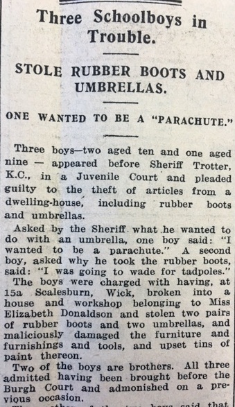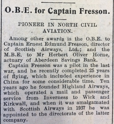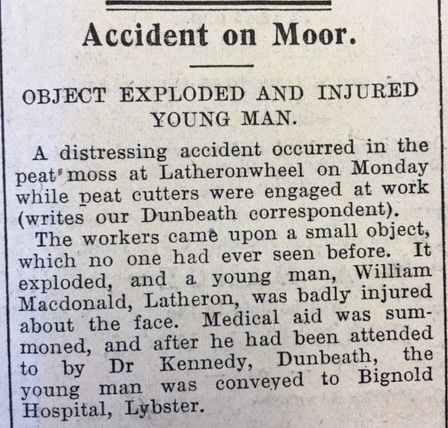 In Caithness, peat-cutting season was now underway. The Head Teacher of Crossroads School in Dunnet recorded in the log book on 11 June: “This week the parent asked exemption for a senior boy for peat cutting. Otherwise the attendance has been very satisfactory.” Unfortunately the risks of this sort of activity in wartime were highlighted this week in a report in the John O’Groat Journal: “A distressing accident occurred in the peat moss at Latheronwheel on Monday while peat cutters were engaged at work… The workers came upon a small object, which no one had ever seen before. It exploded, and a young man, William Macdonald, Latheron, was badly injured about the face.” Also in the John O’Groat Journal this week, three young boys (aged 9 and 10) appeared in Juvenile Court this week accused of stealing articles, including rubber boots and umbrellas, from a dwelling house. The mother of two of the boys had found the stolen goods, “thrashed them for their bad behaviour”, and insisted they return them, but the police had arrived before this could happen. “Asked by the Sheriff what he wanted to do with an umbrella, one boy said, “I wanted to be a parachute.” A second boy, asked why he took the rubber boots, said: “I was going to wade for tadpoles.”” The boys were put on probation for two years. Finally this week, the paper reported that Captain Ernest Fresson had received an OBE. “Captain Fresson was a pilot in the last war, and he recently completed 25 years of flying… Ten years ago he founded Highland Airways, which operated a mail and passenger service from Inverness to Wick and Kirkwall.” Captain Fresson made the inaugural flight himself, landing in Wick on 29 May 1933. Earlier in the same month he flew the first scheduled passenger service on the same route and in November of 1934 he operated the first UK air ambulance flight.Here is a picture of Captain Fresson taken c. 1933 from the Am Baile website. This photo is held at Caithness Horizons in Thurso.