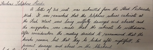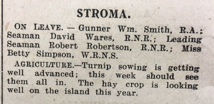 The John O’Groat Journal reported that on Stroma’s fields this week, “Turnip sowing is getting well advanced; this week should see them all in. The hay crop is looking well on the island this year.” The pupils of Auckengill School had to roll up their sleeves for the doctor on 18 June: “Work as usual except during this forenoon when Dr Bruce examined the children and immunised them against Diphtheria.” A meeting of the Wick Harbour Trust this week discussed a letter from the Head Postmaster, saying that the “telephone silence kiosks” in the Fish Mart, “were being wilfully damaged and abused”, and suggesting that they be withdrawn. “After consideration the meeting decided to recommend that the kiosks remain, but that they be locked after nightfall, to prevent damage and abuse in the blackout.” The same meeting also discussed the rotten state of sandbags at the harbour cellars. “These sandbag emplacements had been originally erected for Air Raid Protection, but were now crumbling into disfiguring rubbish.” The Trust resolved to take the matter up with the County Council. Finally this week, the John O’Groat Journal reported the case of Robert Angus, a labourer from Watten, who pleaded guilty to having been drunk and disorderly on the bus between Thurso and Halkirk. Mr Angus had five previous convictions, but the last was in 1921. “Remarking on this fact, Sheriff Trotter said that the accused must have been converted, and it was significant that he had not been in trouble since 1921, the year that Wick went “dry”. (Smiles.) He imposed a modified penalty of 30s, or 20 days.”Coming soon! Week 199, 21st – 27th June 1943, will be published on Monday 20th June 2016. To view previous issues please use the menus on the right hand side of the page.