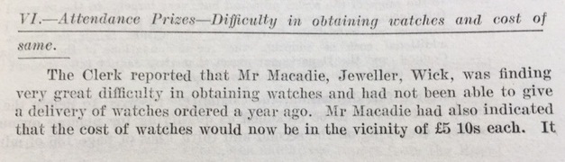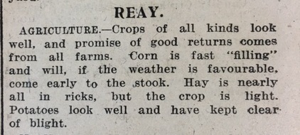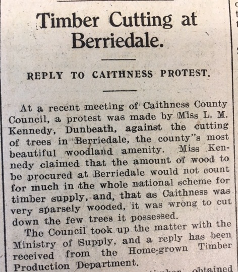 In Caithness the summer harvest was progressing well. As the John O’Groat Journal reported, in Reay “Crops of all kinds look well, and promise of good returns comes from all farms. Corn is fast “filling” and will, if the weather is favourable, come early to the stook. Hay is nearly all in ricks, but the crop is light.” The County Education Committee noted a new problem caused by wartime shortages. Watches had hitherto been given as prizes for pupils with a perfect attendance record; now, however, “Mr Macadie, Jeweller, Wick, was finding very great difficulty in obtaining watches and had not been able to give a delivery of watches ordered a year ago. Mr Macadie had also indicated that the cost of watches would now be in the vicinity of £5 10s each.” Thurso Town Council finally laid to rest the vexed question of the town horse trough being removed for salvage, after they received a petition “signed by owners of horses and rate payers … as [the horse trough] was considered essential for the needs of horses”. Councillor Barry also pointed out “that it was gifted to the town by the late Sir Tollemache Sinclair. On reconsidering the matter the Council agreed to allow the trough to remain.” Finally this week the John O’Groat Journal reported on a plan to cut down a quantity of trees at Berriedale, “the county’s most beautiful woodland amenity”, as part of a national timber scheme by the Home-grown Timber Department. The matter had been raised with the County Council and Miss L.M. Kennedy of Dunbeath had protested on the grounds that “the amount of wood to be procured … would not count for much in the whole national scheme for timber supply, and, that as Caithness was very sparsely wooded, it was wrong to cut down the few trees it possessed.” Unfortunately for the trees of Berriedale they were destined to be cut down by the Canadian Forestry Corps later in the summer.Coming soon! Week 207, 16th – 22nd August 1943, will be published on Monday 15th August 2016. To view previous issues please use the menus on the right hand side of the page.