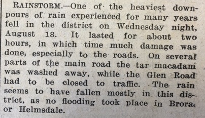 The paper also reported a freak rainstorm in Loth a couple of weeks previously. “It lasted for about two hours, in which time much damage was done, especially to the roads. On several parts of the main road the tar macadam was washed away, while the Glen Road had to be closed to traffic. The rain seems to have fallen mostly in this district, as no flooding took place in Brora or Helmsdale.”