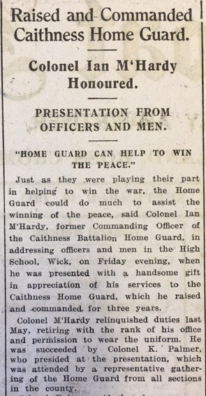 The John O’Groat Journal reported that Colonel Ian M‘Hardy of the Home Guard, who had relinquished duties