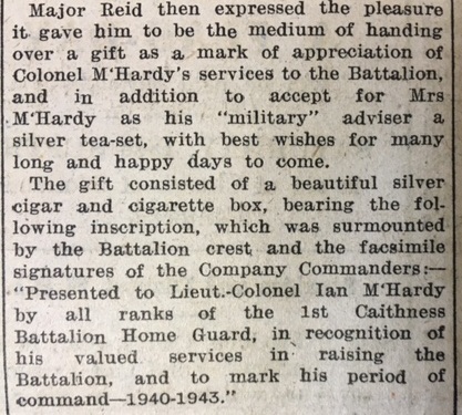 back in May, was honoured at a ceremony at Wick High School. Colonel M‘Hardy, who was also the county’s Director of Education, had raised the Home Guard and commanded it for three years. He was presented with a gift, which “consisted of a beautiful silver cigar and cigarette box bearing [an] inscription, which was surmounted by the Battalion crest and the facsimile signatures of the Company Commanders”.