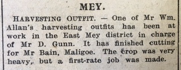 In Caithness the harvest was well underway. The John O’Groat Journal reported that in East Mey, “One of Mr Wm. Allan’s harvesting outfits has been at work… It has finished cutting for Mr Bain, Maligoe. The crop was very heavy, but a first-rate job was done.”