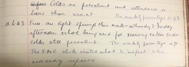 In Caithness schools autumn colds were taking their toll. The log book of Barrock Assembly School in Bower records, “Colds are prevalent and attendance is lower than usual. 11.6.43: There are eight openings this week – on Thursday and Friday afternoons school being used for receiving ration cards. Colds still prevalent.”