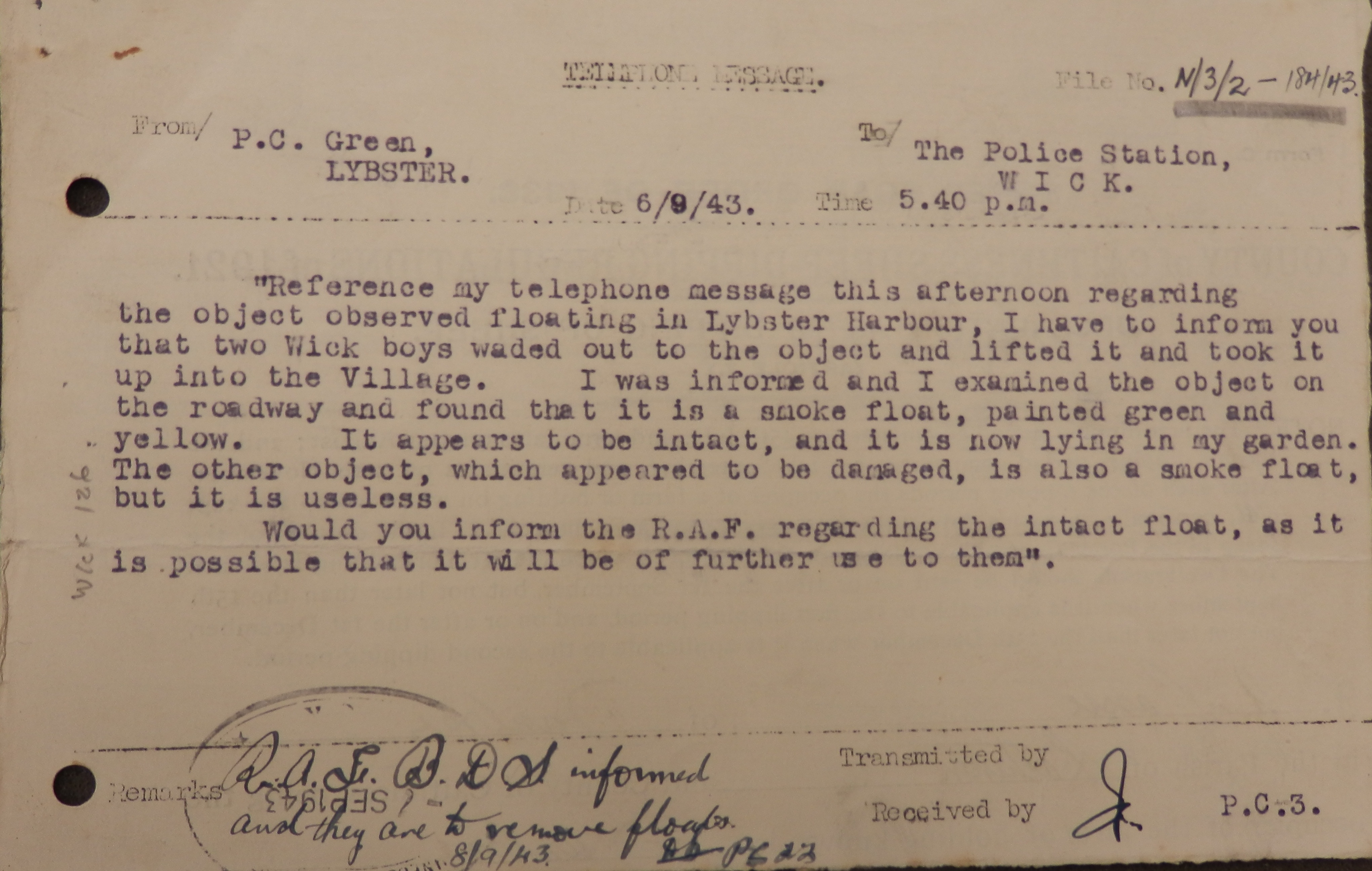 Finally this week, Police Constable Green of Lybster contacted Wick Police on 6 September with the following message: “Reference my telephone message this afternoon regarding the object observed floating in Lybster Harbour, I have to inform you that two Wick boys waded out to the object and lifted it and took it up into the Village. I was informed and I examined the object on the roadway and found that it is a smoke float, painted green and yellow. It appears to be intact, and it is now lying in my garden.”