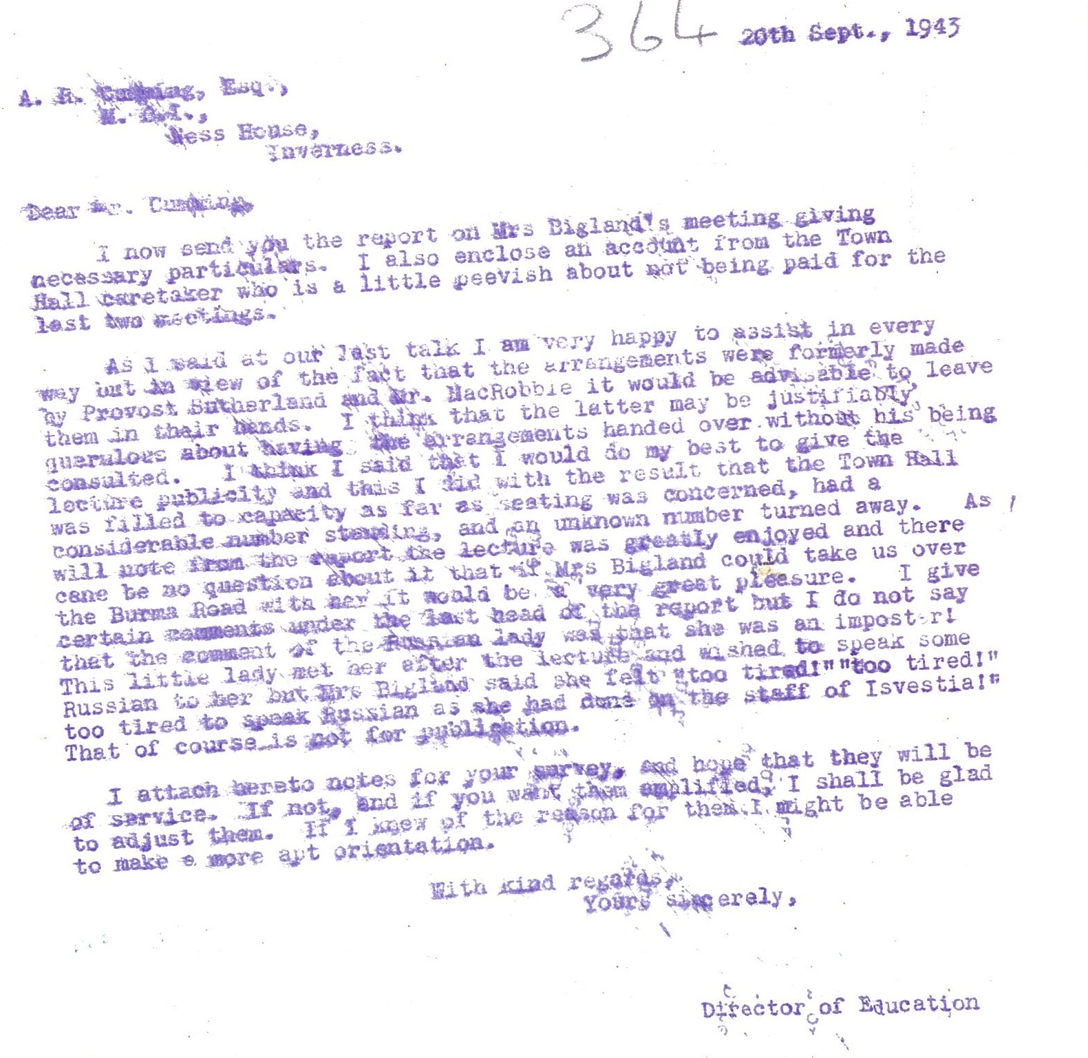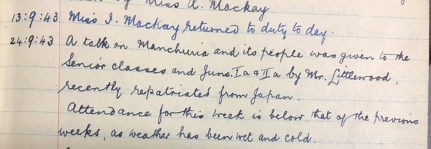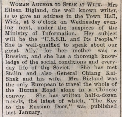 In Caithness, as the John O’Groat Journal reported for Westerdale, “Harvesting operations are in full swing in the surrounding neighbourhood and there is every sign of a bountiful crop. More loads of peat than usual have passed this way from the hills during the season to various parts of the county, thus, we hope, helping to save coal for more essential purposes.” Bower Parish School tersely recorded the autumnal weather in the school log book on 20 September: “Weather wet and stormy; 16 pupils absent”. The pupils of Pulteneytown Academy had an unusual visitor on 24 September: “A talk on Manchuria and its people was given to the Senior classes and Juns. Ia & IIa by Mr Littlewood, recently repatriated from Japan.” As there were very few repatriations of British citizens interned by the Japanese Mr Littlewood may have been one of the lucky ones. Finally this week, there was an unusual intervention at another talk, given by the author Eileen Bigland at Wick Town Hall. The talk was on the subject of the “USSR and Its People”. Mrs Bigland’s mother was a Russian, and as the John O’Groat Journal reported, she had met Stalin and Chiang Kai-Shek, and was the only European to have travelled the whole of the Burma Road “alone in a Chinese convoy.” One member of her audience was, however, unimpressed. As the Director of Education wrote to a correspondent on 20 September, the talk had been very well received. But a Russian lady who was present called Mrs Bigland an imposter, and accused her of working for the newspaper that published the official views of the Soviet government: “This little lady met her after the lecture and wished to speak some Russian to her but Mrs Bigland said she felt too tired. “Too tired! Too tired to speak Russian as she had done on the staff of Isvestia!””Coming soon! Week 213, 27th September – 3rd October 1943, will be published on Monday 26th September 2016. To view previous issues please use the menus on the right hand side of the page.