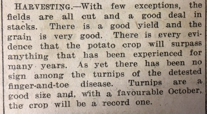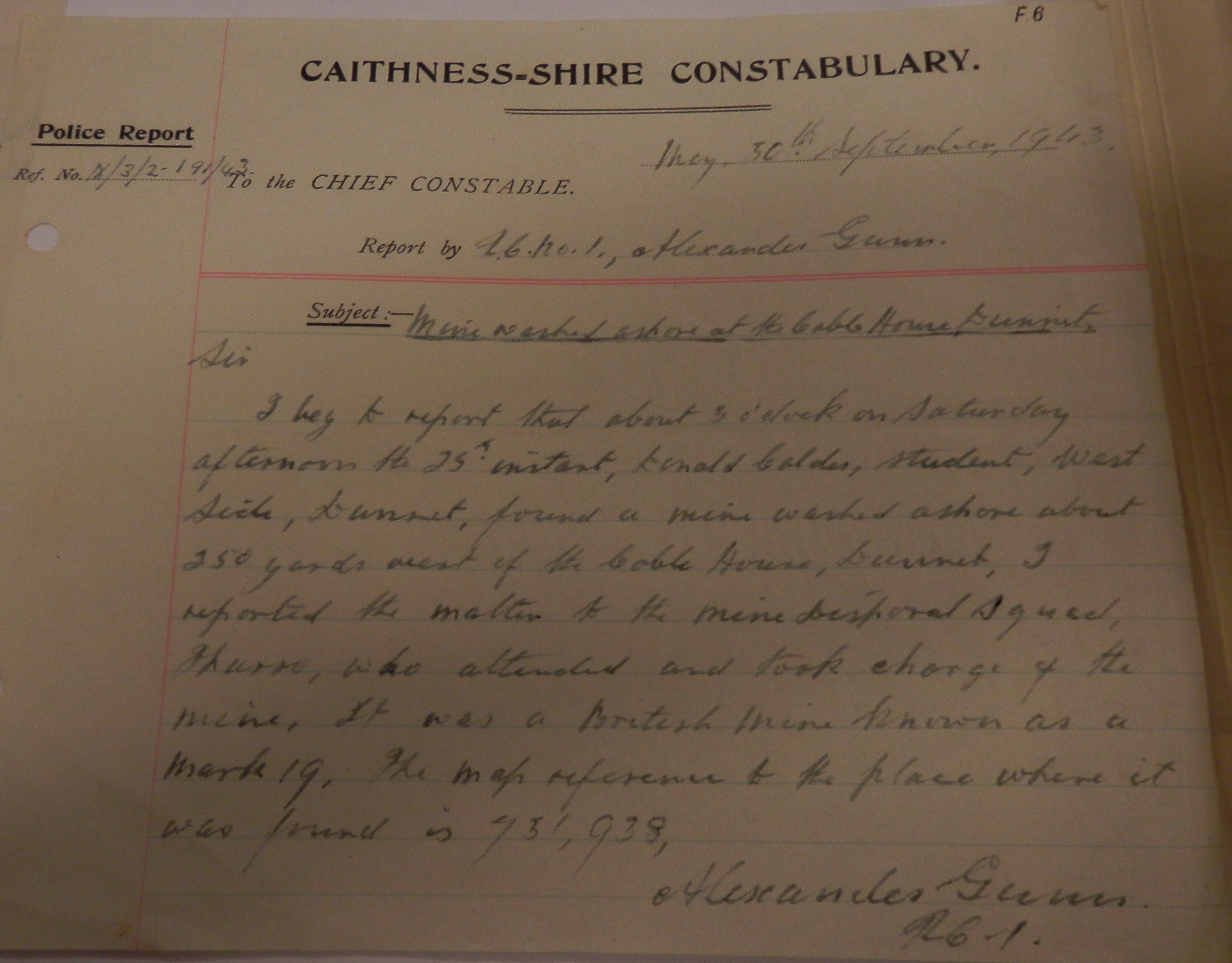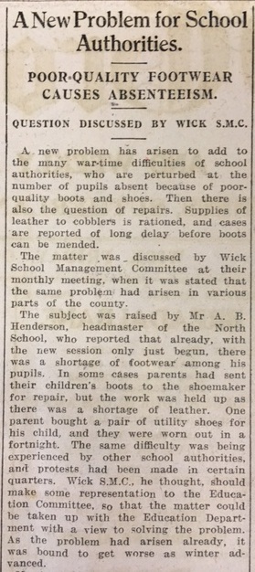 In Caithness the summer harvest was drawing to a close. As the John O’Groat Journal reported, in Reay “With few exceptions, the fields are all cut and a good deal in stacks. There is a good yield and the grain is very good… As yet there has been no sign among the turnips of the detested finger-and-toe disease. Turnips are a good size and, with a favourable October, the crop will be a record one.” On 1 October the head teacher of Thrumster School made a note in the log book about the harvest, and an official visit: “The attendance this week fell to 95.2% chiefly because of harvest work… The police called at the school on Monday and warned three boys who confessed to breaking the windows.” The John O’Groat Journal reported that school attendances were being hit by a new problem caused by wartime shortages, namely “the number of pupils absent because of poor quality boots and shoes. Then there is also the question of repairs. Supplies of leather to cobblers is rationed, and cases are reported of long delay before boots can be mended.” Wick School Management Committee heard from Mr A.B. Henderson, headmaster of the North School who said: “One parent bought a pair of utility shoes for his child, and they were worn out in a fortnight.” (Under rationing, all clothing was manufactured to specific instructions and was restricted to certain types of materials.) Finally this week, Dunnet police sent the following report to Police HQ: “I beg to report that about 3 o’clock on Saturday afternoon the 25th instant, Donald Calder, student, West Side, Dunnet, found a mine washed ashore about 250 yards west of the Coble House, Dunnet. I reported the matter to the Mine Disposal Squad, Thurso, who attended and took charge of the mine. It was a British mine known as a Mark 19.”Coming soon! Week 214, 4th – 10th October 1943, will be published on Monday 3rd October 2016. To view previous issues please use the menus on the right hand side of the page.